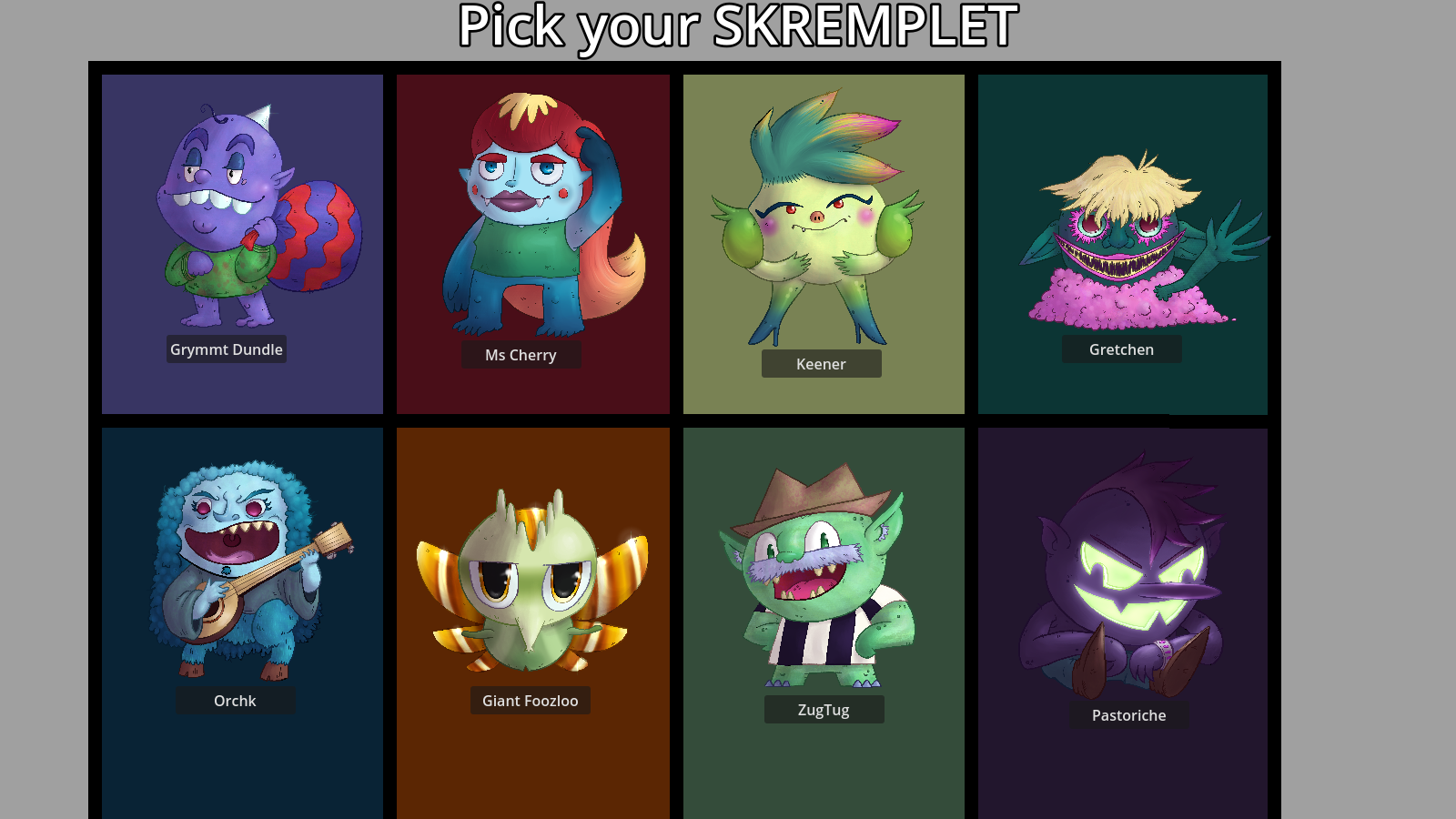 Special Thanks to LKB for the art she Inked and Colored of the main 8 Skremplets as they are used throughout the game, and for all the Ink and Coloring she does every year for these gamejams as those helped with this game as well.